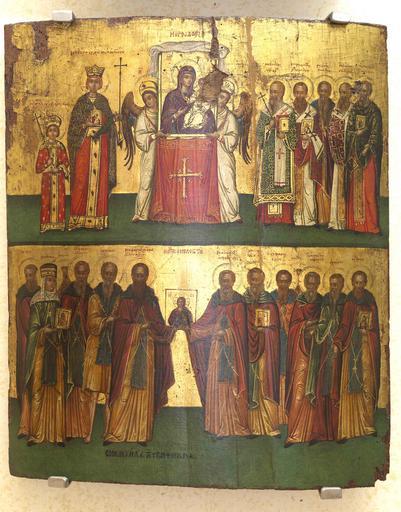 Keywords: Triumph of Orthodoxy by E.Tzanfournaris.jpg Η Κυριακή της Ορθοδοξίας τέλη 16ου- αρχές 17ου αιώνα 37 5x43 5εκ Εμμανουήλ Τζανφουρνάρης Η αράσταση αυτή αρουσιάζει την αναστήλωση των εικόνων ου εορτάζεται α ό την ορθόδοξη εκκλησία κατά την Κυριακή της Ορθοδοξίας Η ε ιφάνεια της εικόνας διαιρείται σε δύο ζώνες Στην ε άνω δύο άγγελοι κρατούν την εικόνα της Παναγίας της Οδηγήτριας ου έχει ορφυρή οδέα και βέλο ανασηκωμένο και στερεωμένο στο ε άνω μέρος Αριστερά αριστάνεται η αυτοκράτειρα Θεοδώρα ου α οκατέστησε τη λατρεία των εικόνων και ο μικρός γιος της αυτοκράτορας ιχαήλ ο Γ΄ Δεξιά βρίσκονται οι ιεράρχες ου ρωτοστάτησαν στην α οκατάσταση των εικόνων Οι μορφές αυτές ταυτίζονται με μικρογράμματες ε ιγραφές Στην κάτω ζώνη βρίσκονται σε δύο ομάδες οι Ομολογητές μοναχοί ου υ ερασ ίστηκαν τις εικόνες οι ο οίοι κρατούν ανάμεσά τους την εικόνα του Χριστού Παντοκράτορα Στην αριστερή ομάδα εικονίζεται και η αγία Θεοδοσία με εικόνα της Παναγίας στα χέρια της http //eib xanthi ilsp gr/gr/icons asp fees 16ou- early 17th century Emmanuel Tzanfournaris Files uploaded by Shakko from various sources PD-old 16th-century icons of Greece Emmanuel Tzanfournaris Triumph of Orthodoxy |