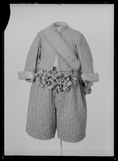 Keywords: Tröja av guldlamé helt täckt av guldbroderi - Livrustkammaren - 18869.tif LSH artwork sv Förmodligen tillverkad i Frankrike Buren av Karl X Gustav 1622-1660 i samband med kröningen <br/>I 1671 års inventarium står En Klädningh som är gjord till H K Maij tz Lÿcklige Cröningh och sägs omfatta följande plagg nämligen kappa tröja byxor knäband skorosor och handskar I 1654 års klädkammarräkning förtecknas dräkten under nr 3 på följande sätt 1 klädning och kappa av filemort gul oskuren sammet helt broderad med guld och med 140 diamantknappar till tröjan och byxorna 1 par strumpeband och skoband av rik guldbrokad helt broderade med guld 1 par underbyxor av incarnadie rosa taft och silkesstrumpor av samma färg 1 guldbroderat med guld och stofferade med guldbrokad 1 panasch plym av couleur de feu röda filemort och aurorafärgade fjädrar 1 par förgyllda sporrar och 1 värja med förgyllt fäste <br/>Nu finns endast tröjan och byxorna i behåll i sitt skick som dräkt medan den stora rundskurna kappan inte längre omtalas i inventarierna efter 1691 1704 års inv säger inget om kappan men den finns förvandlad till mässhake och altarbrun i Riddarsholmskyrkan Skänkta dit den 1 april 1705 av Riksänkedrottningen Hedvig Eleonora Mässhaken Gjord av tjock gul rips OBS Fel Enl Sveriges kyrkor skall vara sammet oskuren ett material som skiljer sig från såväl tröjans som byxornas Broderad med mönster i guld på samma sätt som på tröjan och byxorna Mönsterrapport 8 x 8 cm Såväl fram- som bakstycket består av 2 hopsydda våder av c a 40 cm bredd max längd ca 90 cm Drottningens namnchiffer HRS samt ANNO 1705 har broderats på respektive fram- och baksidorna <br/>Tröjan är sydd av vad man med ett modernt namn skulle beteckna som guldlamé som helt täckts med guldbroderi Den är av s k innocenttyp d v s ett relativt kort livplagg med planschetter inlagda som styvnad i framstyckenas snibbiga främre hörn försett med 10 små skört ståndkrage och relativt korta ärmar med öppna sömmar framtill På vänster framstycke har 17 st 2 cm knapphål sytts med jämna mellanrum ca 1 cm från kanten Vad man bör lägga märke till är att tröjan sytts av ett större antal stycken som skarvats samman Förmodligen har plagget antingen redan varit i tidigare bruk före kröningen 1654 och blivit något förtrångt eller också har man misslyckats med passformen vid tillfället i fråga och har varit tvungen att göra en del ändringar Möjligheten att tröjan kan ha förändrats vid något senare tillfälle kan man inte heller bortse ifrån <br/>Bottenmaterialet består nämligen av två skilda lamétyger ett något gulare i de smalare skarvarna och f ö ett något rödare det egentliga materialet Tröjan är huvudsakligen skuren i 2 framstycken 2 ryggstycken samt 2 ärmstycken till vardera ärmen 10 skört samt krage Man kan alltså visa att framstyckena måste skarvas med remsor av det gulare tyget utefter de raka framkanterna samt även i sidsömmen I halsringningen har en liten kil satts in mellan det vertikala skarvstycket fram och axelsömmen Bakstyckena ha fått var sin vertikala skarv knappt 4 cm bred mitt i ryggen på ömse sidor om mittsömmen Utefter ärmarnas öppna långsidor har vertikala stycken fogats till och nere vid ärmens avslutning har på undersidans stycken en smal horisontell remsa sytts På överärmstycket däremot har en horisontell skarv satts in överst uppe vid ärmringningen Kragen är också uppklippt baktill och försedd med 2 små skarvstycken Det 3 e skörtet på varje sida är eventuellt nysytt ty dess färg förefaller ljusare broderiet är klumpigare och kompositionen annorlunda mot alla de övriga 8 som exempelvis har den lilla blomman nedtill i mitten <br/>Mönstret har i någon mån missuppfattats i de senare sydda styckena så har man t ex lagt krepiner och trådar i båge i stället för att klippa av dem och börja med en ny tråd Ärmarnas nedersta parti mellan 3 5-7 cm är lämnat utan broderi beroende på att det ju skulle vikas till uppslag Ärmarna har inga knappar eller knapphål intill sprunden vid handlederna I midjan sitter på insidan under skörten 8 st små tampar med vardera 2 hål för byxornas hakar Guldlamén har en vådbredd av minst 31 cm utan stad 45x15 tr/cm2 Varje inslag består av gult silke med 2 och 2 smala trinda guldtenar på rätan <br/>Analysresultat <br/>Metalltråd tvinnad med textiltråd huvudbeståndsdelar <br/>Silver xxx<br/>Guld x<br/>Koppar xxx<br/>Zink 0<br/>Det yttäckande läggsömsbroderiet består av kantiljer av trinda tenar och platta lan av olika bredd snodder med silkeskärna omtvinnade med guldlan strängar dragna av trinda tenar av guld eller silver som stansats ut i spiraler eller öglor och manglats platta på halva sidan här benämnda spiral- eller paljett strängar i brist på befintlig terminologi och 2 och 2 tätt liggande strängar med trinda smala guldtenar virade runt ett bredare guldanklätt snöre etc Broderiet är nersytt med gult silke Mönsterraporten är 6 5x6 5 cm Mönstret Ur 2 från varandra utåtböjda palmkvistar som strax nedanför mitten sammanhålles med en uppåtböjd båge växa omväxlande 5- och 8-flikiga icke naturalistiska blommor upp <br/>Analysresultat <br/>Metalltrådsbroderi huvudbeståndsdelar <br/>Silver xxx<br/>Guld xxx<br/>Koppar xxx<br/>Zink 0<br/>Tröjan är garnerad med en 2 3 cm bred knypplad uddspets av guldtråd med 2 inlagda guldlan Mönsterrapporten är c a 2 5 cm Spetsen sitter på bägge främre ytterkanterna knapparna har alltså suttit ovanpå spetsen och fortsätter därifrån omedelbart runt de 2 främre skörten Vidare sitter det spets runt de 3 ytterkanterna av varje skört på axel-och sidsömmarna runt ärmhålen och längs de öppna ärmsömmarna sprunden Den ursprungliga knäppningen finns inte längre kvar diamantknapparna lät änkedrottningen ta ur och använda för annat ändamål Numera knäppes tröjan med hys