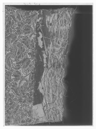 | Keywords: Tröja av svart atlas, 1650-tal - Livrustkammaren - 35809-negative.tif Detta är en dräkt som man mycket gärna skulle vilja sätta i samband med Karl X Gustavs kröning men det finns ännu inget dokumentariskt bevis för detta dräkten ingår ev i fransyska varorna Det är en synnerligen rikt utstyrd dräkt och den har såväl i sitt broderi som i sin foder brokad en ovanligt hög guldhalt I 1671 års inventarium sägs det att dräkten utgörs av kappa tröja byxor knäband skorosor och handskar Allt av svart atlas med Gull heelöfwer borderat Numera är tyvärr dräkten inte längre så fullständig både 1671 och 1676 års inventarier vittnar visserligen om kappans existens men därefter är den försvunnen man hade redan 1671 tagit bort spetsarna av guld och 20 år senare omtalas kappan ej längre Nuvarande inventarium omtalar blott tröja byxor och 1 handske Under ett annat inventarienummer 3435 har emellertid kunnat identifieras ett dräkttillbehör nämligen ett gehäng med samma broderi Den svarta atlasen har en vådbredd av ca 53 cm utan stad Staden är 1 3 cm bred 10 gröna 10 vita 10 gröna 10 vita 10 gröna samt 5 tjocka svarta trådar - tuskaft Trådarnas antal kan variera Det hela ytan täckande broderiet är utfört i läggsöm och har en mönsterrapport av h 10 cm b 6 8 cm Det är utfört med olika sorters guldkantiljer samt paljettsträngar Längs en del kantsömmar har man sytt på ett smalt guldsnöre bestående av en tvinnad tråd omspunnen med lan Broderiet är nersytt med vitt och gult silke samt tjockare rosa lintråd <br/><br/>Analysresultat Tråd och lan av legerat guld huvudbeståndsdelar <br/>Silver xx<br/>Guld xxx<br/>Koppar xxx<br/>Zink 0<br/><br/>Mönstret är ett stiliserat blomstermönster där ett ringformigt omtag snarast utvecklats till en krona som utdragna klockliknande blomkalkar vända sig till eller ifrån I plaggen kan man observera att broderiet uppvisar olika kvaliteter och här kan även spåras skarvar i tyget underlaget De tillskurna bitarna uppvisa en klumpigare torrare karaktär i broderiets utförande samt smärre avvikelser från det gängse utförandet Så t ex har i tröjan den lilla 5-bladiga blomman ovanför kronan sitt översta mellersta blad sytt med horisontella kantiljer istället för vertikala som det borde varit Mönstret är också gyttrigare och oredigare Kronans tinnar är omramade av i öglor lagda konturtrådar och ej som i det ursprungliga broderiet där konturen går upp och ned <br/>Mönsterrapport ca h 77 mm b 58 mm Tröjan av innocenttyp är sydd med 2 framstycken som utökats såväl upptill på axelpartiet som utefter ärmringningen och längs sidosömmen med tillsatta bitar I ryggen har skarvstyckena infogats längs en mittsöm ursprungligen kunde ryggstycket ha varit helt Nu ligger emellertid på ömse sidor mittsömmen en smal blott 1 5 cm bred skarv Likaså har man även baktill gjort tröjan något längre genom skarvar utefter axel- och halsringningarna Ärmarna har bara utvidgats obetydligt genom en skarvad remsa utefter underärmstyckets bakre övre del samt på bägge styckena nertill utefter ytterkantens söm ärmsprundets sida ca 27 cm Kragen har klippts upp på samma sätt som ryggstycket så att intill mittsömmen 2 små skarvstycken ligga på ömse sidor synbarligen även placerade upp- och nedvända Tröjan har 10 skört och i midjesömmen sitta på insidan 8 st byxtampar vardera med 2 hål Fodret utgöres av guldbrokad med svart botten Det har en vådbredd av minst 47 cm ev ca52 x 14 á 15 tr/cm2 Det är en ripsvävnad med varp av svart otvinnat silke Inslagen är 14 st med gult silke högertvinnad med guldlan samt 14 st med gult silke högertvinnad med guldlan samt 14 st svarta med guldlan på rätan Stad ca 1 3 cm 8 gröna 9 vita 12 gröna 8 vita 11 gröna 6 svarta trådar - de färgade i atlasbindning de svarta i lärftsbindning Mönsterrapport h 7 7 cm b 5 8 Mönstret består av halvnaturalistiska små blomsterkvistar <br/><br/>Analysresultat Metalltråd tvinnad med textiltråd huvudbeståndsdelar <br/>Silver xxx<br/>Guld xx<br/>Koppar xx<br/>Zink 0<br/><br/>Då fodret är mycket trasigt och slitet har man fodrat in kragen och den övre delen av tröjan med svart taft Skörten som ju också är fodrade med brokaden har fått bitar av denna på varierande led Man har givetvis velat utnyttja det dyrbara materialet till fullo I framkanten på vänster sida har tröjan en knapphålsrad med 23 knapphål 2 cm långa På motstående sida finns 22 knappar i behåll de är 1 2 cm i diameter Knapphålsraden är på undersidan fodrad med guldbrokad av samma typ som finns i byxornas fickor Nertill i framstyckena finns planschetter som når t o m det 13 e knapphålet eller är ca 22 cm långa Dessa är klädda med något grövre linnelärft än den oblekta linnelärft som utgör mellanfoder i tröjan 23x18 tr/cm2 Det finns 3 knappar med tränsar i ståndkragen Knapparna är överklädda med olika guldtrådar lan och kantiljer I midjan på tröjan har man mellan fodren lagt en avklippt stadremsa vävd randig i gult och orange med svart som ev är en avklippt stad från någon annan dräkts tyg ev den oskurna svarta sammetsdräkten nr 3421 Detta för att ge mera styrsel åt plagget Att man klippt till plaggets olika delar och beräknat sömmarnas placering innan man broderat dem visar bl a ärmarnas nedre parti som på den broderade sidan ju skulle vikas till uppslag De har alltså ej behövt broderas ända ned utan man har lämnat den svarta atlasen bar på ett knappt 10 cm brett stycke Blott mitt fram på högra sidan under knappraden finns en knypplad ca 1 7 cm bred guldspets med guldlan kvar original caption Karl X Gustavs kröning Kristinas kröning Karl X Gustav och Hedvig Eleonoras bröllop 1647 LRK Karl X Gustav av Sverige Modelejon 2002 place of origin original filename LN_B12774_015654 55955 inventory number LRK 19340 35809 CC0 Tröja av svart atlas 1650-tal - Livrustkammaren - 35809 tif 