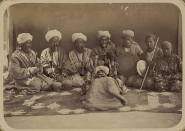 | Keywords: Troupe of Musicians. Group of Musicians and a Batcha, or Dancing Boy WDL11112.png Artwork ru Кун Александ Людвигович 1840 1888 гг fr Kun Aleksandr L 1840-1888 en Kun Aleksandr L 1840-1888 zh 亚历山大·L· ,1840-1888 年 pt Kun Aleksandr L 1840-1888 ar كُن، ألكسندر ل ، 1840-1888 es Kun Aleksandr L 1840-1888 ru Т уппа музыкантов Г уппа музыкантов и батча или танцующий мальчик fr Troupe de musiciens Groupe de musiciens et batcha ou jeune danseur en Troupe of Musicians Group of Musicians and a Batcha or Dancing Boy zh 乐师团 群乐师和 位 巴查 (跳舞的男孩) pt Trupe de músicos Grupo de músicos e um batcha ou menino dançarino ar فرقة موسيقية مجموعة من الموسيقيين وباتشا أو صبي راقص ru Эта фотог афия входит в этног афическую часть <em> Ту кестанского альбома </em><em></em> всесто оннего исследования Цент альной Азии п едп инятого после того как в 1860-х годах в егионе установилось господство Российской импе ии Альбом созданный по аспо яжению гене ала Константина Пет овича фон Кауфмана 1818 1882 годы пе вого гене ал-губе нато а оссийского Ту кестана состоит из четы ех частей в шести томах «Часть а хеологическая» два тома «Часть этног афическая» два тома «Часть п омысловая» один том и «Часть исто ическая» один том Основным составителем альбома был оссийский востоковед Александ Людвигович Кун аботавший совместно с иколаем Венедиктовичем Богаевским В альбоме п едставлено около 1200 фотог афий а также а хитекту ные планы аква ельные исунки и ка ты «Часть этног афическая» включает в себя 491отдельную фотог афию на 163 листах а фотог афиях изоб ажены п едставители азличных на одов егиона листы 1 33 повседневная жизнь и итуалы листы 34 91 а также виды де евень и го одов уличные то говцы и комме ческая деятельность листы 92 163 <br>Танцо ы; Этног афические фотог афии; Г упповые по т еты; узыкальные инст ументы; узыканты; Фотог афические исследования; По т етные фотог афии; Тю кские на оды fr Cette photographie est extraite de la partie ethnographique de l'<em>Album du Turkestan</em> étude visuelle complète de l'Asie centrale entreprise après que l'Empire russe prit le contrôle de la région dans les années 1860 Commandé par le général Konstantin Petrovich von Kaufman 1818 1882 premier gouverneur général du Turkestan russe l'album est composé de six volumes en quatre parties la partie archéologique deux volumes la partie ethnologique deux volumes la partie sur les métiers un volume et la partie historique un volume L'album fut essentiellement compilé par l'orientaliste russe Aleksandr L Kun assisté de Nikolai V Bogaevskii Il comporte près de 1200 photographies et inclut également des plans architecturaux des dessins à l'aquarelle et des cartes La partie ethnographique compte 491 photographies sur 163 planches montrant des individus des différentes peuplades de la région planches 1 à 33 des scènes de la vie quotidienne et des rites planches 34 à 91 ainsi que des vues de villages et de villes de vendeurs ambulants et d'activités commerciales planches 92 à 163 <br>Danseurs; Photographies ethnographiques; Portraits de groupe; Instruments de musique; Musiciens; Inventaires photographiques; Portraits photographiques; Peuples turciques en This photograph is from the ethnographical part of <em>Turkestan Album</em><em> </em>a comprehensive visual survey of Central Asia undertaken after imperial Russia assumed control of the region in the 1860s Commissioned by General Konstantin Petrovich von Kaufman 1818 82 the first governor-general of Russian Turkestan the album is in four parts spanning six volumes Archaeological Part two volumes ; Ethnographic Part two volumes ; Trades Part one volume ; and Historical Part one volume The principal compiler was Russian Orientalist Aleksandr L Kun who was assisted by Nikolai V Bogaevskii The album contains some 1 200 photographs along with architectural plans watercolor drawings and maps The Ethnographic Part includes 491 individual photographs on 163 plates The photographs show individuals representing the different peoples of the region Plates 1 33 ; daily life and rituals Plates 34 91 ; and views of villages and cities street vendors and commercial activities Plates 92 163 <br>Dancers; Ethnographic photographs; Group portraits; Musical instruments; Musicians; Photographic surveys; Portrait photographs; Turkic peoples zh 这张照片出自<em> 其斯 相册 </em>的民族部分,该相册是俄罗斯 国 19 世纪 60 年代取得中亚控制 后, 手制 的 部针对该 区的综合 图像调查记录 相册由俄罗斯驻 其斯 (俄罗斯 国中亚属 的名称)首任 康斯 丁·彼得罗维奇·凡· 夫曼(Konstantin Petrovich von Kaufman,1818 82 年)将军赞助完成,共分六卷,四个部分: 古部分 (两卷); 民族部分 (两卷); 贸易部分 ( 卷)和 历史部分 ( 卷) 相册的主要编纂人是俄罗斯 方学 亚历山大·L· Aleksandr 