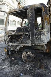 Keywords: truck burnt damage destruction destroyed arson wreck vehicle transportation risk metal