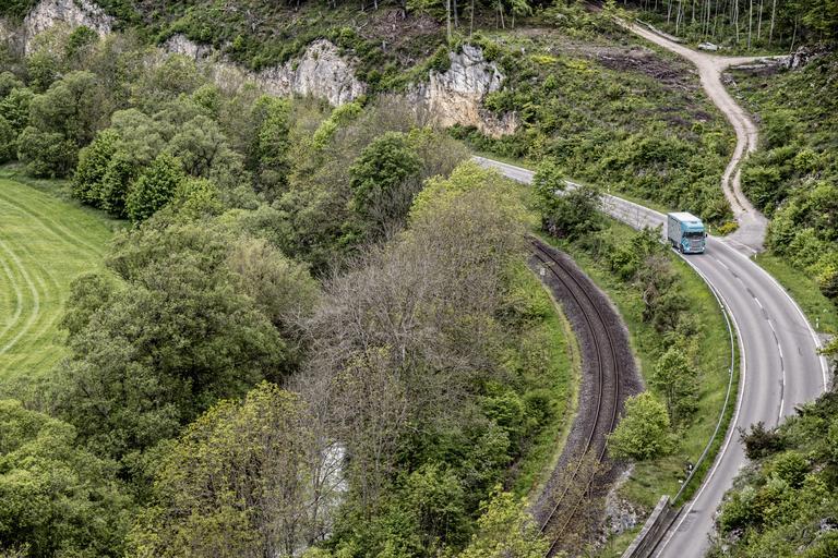 Keywords: truck danube valley road roadway valley mountains hill goods freight transport landscape mood view rock forest distant environment traffic toll bypass heavy duty idyll