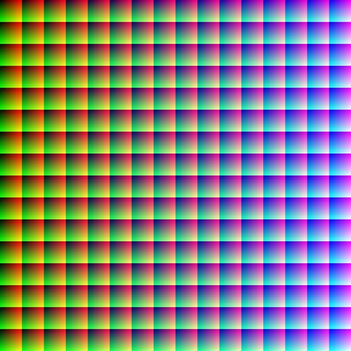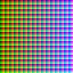 Keywords: True colour.PNG en Full true colour 24-bit RGB palette The red shade changes by 1 across the y-axis the green shade changes by 1 across the x-axis and the blue changes by 1 in each new 256 256 block There is a total of 256 256 256 or 16 777 216 colours The final 4096 4096 image was too large to make all at once in Java the virtual machine reports java lang OutOfMemoryError Java heap space so I made this by splitting it into four different sections top left top right bottom left and bottom right and combining them in MS paint The program to make such a simple image is therefore pretty complex and requires 8 classes to make it work own 06 57 21 May 2010 UTC Simpsons contributor talk Simpsons contributor en Original upload log en wikipedia FtCG page en wikipedia True_colour PNG wikitable - 00 47 29 September 2012 4 096 × 4 096 56 030 bytes DMahalko w en <nowiki> Reverted to version as of 04 51 18 June 2012 - Size reduction to 2048x2048 results in a non-accurate image Image size must remain 4096x4096 to encompass all 16 777 216 colors of the 24-bit palette If you want a smaller inaccurate substitute upload </nowiki> - 20 10 13 August 2012 2 048 × 2 048 51 899 bytes Ronhjones w en <nowiki> Image display issue cannot be fixed by optimisation - it's just too many pixels the only way to display is to do a 2 into 1 reduction </nowiki> - 04 51 18 June 2012 4 096 × 4 096 56 030 bytes Julyo w en <nowiki> Optimized filesize with OptiPNG PNGOUT AdvPNG and DeflOpt; most optimization resulted from reducing colorspace from 32-bit RGBA to 24-bit RGB </nowiki> - 14 43 21 May 2010 4 096 × 4 096 23 227 397 bytes Simpsons contributor w en <nowiki> </nowiki> - 06 57 21 May 2010 4 096 × 4 096 23 261 227 bytes Simpsons contributor w en <nowiki> Full true colour 24-bit RGB palette The red shade changes by 1 across the y-axis the green shade changes by 1 across the x-axis and the blue changes by 1 in each new 256 256 block There is a total of 256 256 256 or 1 </nowiki> RGB |