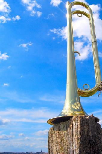 Keywords: trumpet copper music musical instrument sky blue cloudy sky