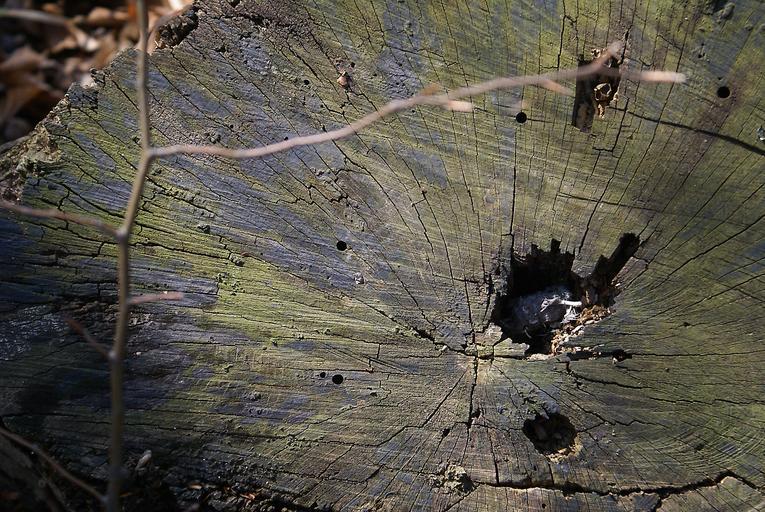 Keywords: trunk cut down a tree lying in stock próchniejący stock cross section of the trunk jars trunk cracks hole gray lichens relief figure floored block sprig old young nature life cycle wood spring