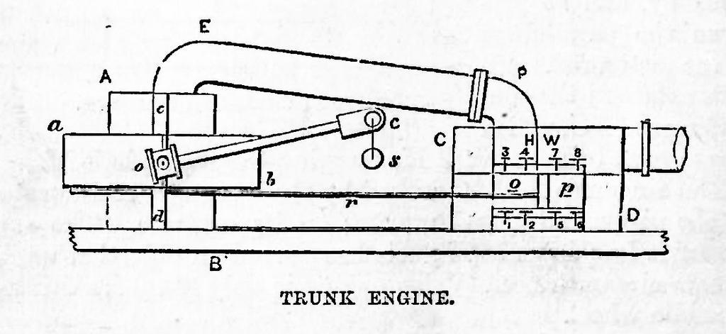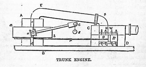 Keywords: Trunk engine.jpg en A trunk engine a type of naval engine developed in the mid-19th century designed to have a profile low enough to fit entirely below the waterline of a ship thus ensuring its safety from enemy fire The accompanying text for this diagram in the original source is as follows Each engine is generally worked by two cylinders The cylinder A B is laid on its side; and down the centre passing through both ends of the cylinder goes a large trunk a b on which all in one piece is cast the piston c d so that the effective working part of the piston is an annulus or ring The trunk is fitted steam tight by means of stuffing boxes The connecting rod is attached to a pin at o fixed in the middle of the trunk while the other end engages and works the crank c s where s is the main shaft C D the rectangular figure to the right the condenser is divided into the condenser proper the hot well and the pump barrel The large pipe E P is called the eduction pipe; its purpose is to bring the exhaust steam into the condenser where it is condensed at the bottom after which the double acting pump p delivers the water into the hot well H W Evers Henry 1873 Steam and the Steam Engine Land Marine and Locomotive William Collins Sons Co London and Glasgow p 90 Author 1873 anonymous-EU Trunk engines Direct-acting marine steam engines |