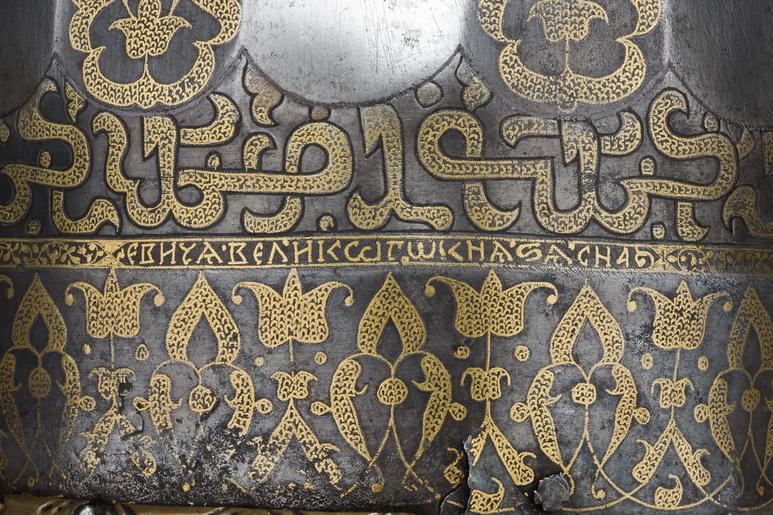 | Keywords: Tsar Ivans hjälm. Detalj på en av de 4 textrader som löper runt hjälmen - Livrustkammaren - 87049.tif  LSH artwork uk Шолом московського князя Івана Васильовича 1533  ік en The helmet of a Muscovy Ivan the Terrible 1533 Spetsig hjälm av stål med påslagen gulddekor Nertill en ca 35 mm bred rand med symmetrisk rankdekor där blommor och blad är täckta av små guldbågar Därovanför ett 5 mm brett band med guldkanter och rankdekor där bladen är helt av guld I bandet är utsparade fält med spetsiga ändar vartannat med bladrankor vartannat med gammalrysk guldtext fyra textfält Hjälm som tillhört furst Ivan Vasiljevitj son till storfursten Vasilij Ivanovitj herre och hela Rysslands självhärskare Därovanför ett band b 20-25 mm med arabisk-liknande skrifttecken med breda staplar med påslagna guldbågar och breda punsade kantlinjer urspr täckta av silver Därovanför uppåt avsmalnande fält med bågformig avslutning nertill i form av en påslagen silverlinje vartannat fält blankt vartannat med bladrankor av guld Hjälmklockan avslutad upptill med ett band b 25 mm med bladrankor <br/>Längs nederkanten fastnitat med nitar med kulformiga huvuden en något profilerad rundad mässingslist listen saknas på tre ställen Upptill en konisk spets l 108 avslutad med en snedräfflad kula på spetsen nertill övre delen av klockans rankdekor därovanför ett band med rankdekor b 15 mm Övre dleen av spetsen schackrutig med långa rektangulära blanka och rankdekorerade fält dekoren delvis utsliten Spetsen är fastnitad på platta som förts upp i hjälmklockan underifrån men är nu rörlig runt aeln original caption Tsar Ivans hjälm Detalj på en av de 4 textrader som löper runt hjälmen LRK 20389<br/> Nyckelord Rustningshjälm Tsar Ivan IV Detalj Blankvapen Föremålsbild Erövringen av Warszawa Stora oredan<br/> Stora oredan Moskwa Slaget vid Lode ca 1533 steel - silver - brass - gold g 1180 size mm 190 minsta size mm 190 största size mm 380 LRK Ivan IV av Ryssland tsar Basutställning utställning i Moskwa 1965 Moskwa Livrustkammarens basutställning 1978 Gustav II Adolf 350 år efter Lützen 1982-1984 Islamiskt i de kungliga samlingarna 1984 Kungens lockpipa 1995-1996 Karl XII och Peter den store 1998-1999 The Moscow Kremlin Reflected in its 800-Years History 2004 Der Kreml Gottesruhm u Zarenpracht 2004 From Tsar to Emperor Moscow - Saint Petersburg 2005-2006 Art of Ivan the Terrible's Age arbets- namn 2007-2008 Krigsbyte 2007-2008 State Museum of the Moscow Kremlin + Astrakhan Historico-Architectural Museum 2009 Sainte Russie de la Rus  de Kiev à la Russie de Pierre le Grand Louvren 2010 Ryssland och Sverige under 1600-talet Basutställning place of origin original filename lm_dig4688_20389 56957 inventory number LRK 20389 87049 CC-BY-SA Jens Mohr <gallery caption Different images of same object > File Detalj tsar Ivans hjälm - Livrustkammaren - 8870 tif File Hjälm Oruzejnaja Palata Moskva ca 1533 - Livrustkammaren - 17456 tif File Tsar Ivans hjälm Detalj på en av de 4 textrader som löper runt hjälmen - Livrustkammaren - 87048 tif File Tsar Ivans hjälm - Livrustkammaren - 87045 tif File Detalj tsar Ivans hjälm - Livrustkammaren - 311 tif File Tsar Ivans hjälm - Livrustkammaren - 87046 tif File Tsar Ivans hjälm - Livrustkammaren - 3 tif File Tsar Ivans hjälm Detalj på en av de 4 textrader som löper runt hjälmen - Livrustkammaren - 87050 tif File Tsar Ivans hjälm Detalj på en av de 4 textrader som löper runt hjälmen - Livrustkammaren - 87047 tif </gallery> Jens Mohr Russian medieval helmets Military helmet images from Livrustkammaren Color images from Livrustkammaren Media contributed by LSH unmatched event Media contributed by LSH dim-with multiple size templates Media contributed by LSH unmatched keyword Media contributed by LSH 2013-10 |