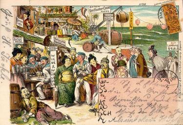 Keywords: Tsingtau Postkarten 1898.jpg en historic postcard of Qingdao China around 1900 Immanuel Giel own 10 00 10 July 2006 UTC Qingdao 1890 1898 PD-old Postcards of Qingdao Sailors Drinking in art Humorous postcards of China Manchu queues Exotic representations of China in European culture |