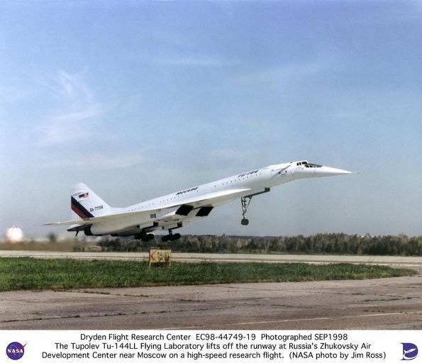 Keywords: Tu-144LL SST Flying Laboratory Lifts off Runway on a High-Speed Research Flight DVIDS692512.jpg en The Tupolev Tu-144LL lifts off from the Zhukovsky Air Development Center near Moscow Russia on a 1998 test flight NASA teamed with American and Russian aerospace industries for an extended period in a joint international research program featuring the Russian-built Tu-144LL supersonic aircraft The object of the program was to develop technologies for a proposed future second-generation supersonic airliner to be developed in the 21st Century The aircraft's initial flight phase began in June 1996 and concluded in February 1998 after 19 research flights A shorter follow-on program involving seven flights began in September 1998 and concluded in April 1999 All flights were conducted in Russia from Tupolev's facility at the Zhukovsky Air Development Center near Moscow The centerpiece of the research program was the Tu 144LL a first-generation Russian supersonic jetliner that was modified by its developer/builder Tupolev ANTK aviatsionnyy nauchno-tekhnicheskiy kompleks-roughly aviation technical complex into a flying laboratory for supersonic research Using the Tu-144LL to conduct flight research experiments researchers compared full-scale supersonic aircraft flight data with results from models in wind tunnels computer-aided techniques and other flight tests The experiments provided unique aerodynamic structures acoustics and operating environment data on supersonic passenger aircraft Data collected from the research program was being used to develop the technology base for a proposed future American-built supersonic jetliner Although actual development of such an advanced supersonic transport SST is currently on hold commercial aviation experts estimate that a market for up to 500 such aircraft could develop by the third decade of the 21st Century The Tu-144LL used in the NASA-sponsored research program was a D model with different engines than were used in production-model aircraft Fifty experiments were proposed for the program and eight were selected including six flight and two ground engine tests The flight experiments included studies of the aircraft's exterior surface internal structure engine temperatures boundary-layer airflow the wing's ground-effect characteristics interior and exterior noise handling qualities in various flight profiles and in-flight structural flexibility The ground tests studied the effect of air inlet structures on airflow entering the engine and the effect on engine performance when supersonic shock waves rapidly change position in the engine air inlet A second phase of testing further studied the original six in-flight experiments with additional instrumentation installed to assist in data acquisition and analysis A new experiment aimed at measuring the in-flight deflections of the wing and fuselage was also conducted American-supplied transducers and sensors were installed to measure nose boom pressures angle of attack and sideslip angles with increased accuracy Two NASA pilots Robert Rivers of Langley Research Center Hampton Virginia and Gordon Fullerton from Dryden Flight Research Center Edwards California assessed the aircraft's handling at subsonic and supersonic speeds during three flight tests in September 1998 The program concluded after four more data-collection flights in the spring of 1999 The Tu-144LL model had new Kuznetsov NK-321 turbofan engines rated at more than 55 000 pounds of thrust in full afterburner The aircraft is 215 feet 6 inches long and 42 feet 2 inches high with a wingspan of 94 feet 6 inches The aircraft is constructed mostly of light aluminum alloy with titanium and stainless steel on the leading edges elevons rudder and the under-surface of the rear fuselage NASA Identifier NIX-EC98-44749-19 2009-09-23 Glenn Research Center https //www dvidshub net/image/692512 692512 2012-10-10 12 51 WASHINGTON DC US PD-USGov Langley Research Center Images from DoD uploaded by Fæ |