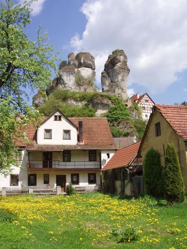 Keywords: Tüchersfeld.jpg Franconian Switzerland Bavaria Turmkarst in Tüchersfeld Dorf in der Fränkischen Schweiz In der humiden gemäßigten Warmklimazone u a Europa seltene Karsterscheinung nur in der nördl Frankenalb Dieser Karst aus der Unterkreide vor ca 100 Mio Jahren tauchte unter der bis zum Quartär nahezu gänzlich ausgeräumten Oberkreide wieder auf vom Author selbst fotografiert --Xocolatl talk 22 10 13 June 2008 UTC 2008 Burg Niederntüchersfeld Karst topography in Germany |
