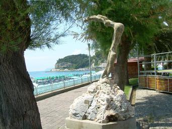| Keywords: Tuffatrice.JPG scultura in cementi acciaio pietra dimensione max 305 cm la roccia e' parte integrante della scultura Celle Ligure 2005 GFDL Cc-by-sa-3 0-migrated commento del critico Specifico Nuova scultura a Celle Ligure E ' stata inaugurata di recente la svettante scultura La Tuffatrice dello scultore genovese un'opera fortemente aerodinamica alta m 1 85 e composta da un paio di gambe unite tese nello sforzo di concentrazione per il salto nel vuoto che proseguono nella solidità di un corpo femminile piegato in avanti a squadra all'altezza della vita con braccia e testa chine verso il basso Prende così forma la silhouette di una giovane donna che specie verso il culmine della statua evoca alla percezione visiva l'agile forma di un guizzante delfino L'opera è stata realizzata in cemento e pietra con armatura d'acciaio dalle tonalità oscillanti tra squamature brunite e macchie biancastre a carattere schiumoso Sembra quasi materializzarsi un vibratile derma chiazzato in alcuni punti di porosa salsedine Infatti questa affascinante scultura è stata posizionata sulla sommità di uno scoglio collocato sulla passeggiata a mare di Pennello in prossimità di Celle Ligure così da spruzzarsi di mare entro il quale idealmente dovrebbe tuffarsi Il genovese è solido scultore di figure umane ed animali sovente al limite della figurazione e spesso intese come blocchi petrigni carichi di energia in tensione come è il caso di questo lavoro in cui il corpo è contratto nella solidità muscolare e concentrato nel compimento di un atletico e perfetto tuffo Questa opera è copia di un'altra scultura ed è stata assegnata dall'autore alla cittadina di Celle è stata posizionata sulla passeggiata a mare in occasione del gemellaggio tra la cittadina di Celle in Germania e la nostra cittadina balneare omonima avvenuto venerdì 19 e sabato 20 maggio <br/> Miriam Cristaldi generale Tematica della scultura ricerca di soluzioni tecniche e rappresentazione delle emozioni Gran parte delle conversazioni sulla scultura avute con il maestro è stata spesa intorno a problemi relativi alla specifica ricerca di alchimistiche combinazioni tra materiali lapidei oppure sui vizi e le virtù delle pietre naturali le più e le meno pregiate come quelle più o meno lavorabili e ancora su complessi studi per ottenere l ™effetto del bronzo lavorando la pietra e così via Questi racconti avvincenti che spiegano il nucleo della ricerca di Alfonso Gialdini si dirigono poi abitualmente verso l ™affascinante rievocazione della volta in cui riuscì a procurarsi per farci una scultura uno splendido e unico blocco di legno tek -forse l ™albero di un ™antica nave o la trave di una vetusta costruzione- o di quando trovò in natura un piccolo e circoscritto giacimento di pietra da lavorare Il suo ufficio domestico separato dall ™officina in cui scolpisce ricorda un piccolo studiolo rinascimentale dove innumerevoli componenti si uniscono in un insieme unitario e indecifrabile arnesi curiosità fossili miniature fogli disposti ordinatamente in perfetto disordine Evidentemente dello scultore accanto alla priorità di una vivida umanità emerge il sostrato dei suoi compiuti studi di ingegneria meccanica che lo portano a legare fortemente l ™azione creativa e ideativa in lui libera e sensibilmente emotiva con i meccanismi di controllo e programmazione propri del metodo scientifico Il risultato è sorprendente perché si rivela capace tanto di far comprendere le virtù tecnico-costruttive della scultura quanto di trasportarci con immediatezza nel mondo delle idee e delle emozioni L ™artista investe sia in scultura figurativa sia in opere di ricerca dinamica astrattamente formali scolpisce in sintesi seguendo un ™ispirazione di tipo sintetico-antropomorfo L ™oggetto principale del suo studio è la rappresentazione della figura femminile proposta in numerose varianti di sensibilità ferina Venere steatopigica di sapore tribale o esile ma monumentale tuffatrice sospesa per aria Ancora fatta tutta di membra calda protettrice dell ™uomo che avvolge con forti abbracci o fiera sostenitrice del primario contributo femminile alla vita quando non ambisce a suonare con il proprio corpo come la cassa armonica del violino L ™alternativa per lo scultore sono le teste di cavallo naturalistiche rappresentazioni di colli nervosi negli studi per sé o dinamiche e forti macchine belliche come locomotive in corsa con le redine che diventano bielle cavalli che sono il simbolo della corsa alla liberazione dei popoli bestie forti e docili che stramazzano sacrificandosi di fronte a un ingiusto e violento trattamento del padrone Il Rompighiaccio sul tema-studio delle teste di ariete rappresenta ancora questa tensione potente difficilmente governabile lanciata verso un destino mortale A Genova il maestro dal 1995 mette a disposizione dei degenti dell ™ex ospedale psichiatrico di Quarto i propri mezzi e conoscenze organizzando corsi di scultura all ™interno di un programma di riabilitazione espressiva ottiene particolari successi nel veder migliorare anche attraverso questa esperienza la condizione degli allievi Marco Franzone saggista in storia arte genovese La Tuffatrice Alfonso Gialdini |
