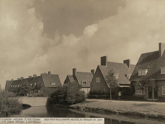 | Keywords: architecture urban design urbandesign architectuur stedenbouw gezondheid health volksgezondheid nai collectie collection then/now thennow outdoor monochrome H.P. Berlage, M.J. Granpré Molière, J. Verhagen en J. Kok. Woonhuizen Tuindorp Vreewijk, Rotterdam, 1913-1919. Collectie NAi, TENT n12 In 1898 verscheen de publicatie van Ebenezer Howard‘Tomorrow: a Peaceful path to real reform, waarin Garden Cities werden aangeprezen als oplossing voor de problemen van de vieze en immorele stad. Het doel was om de voordelen van de stad (werkgelegenheid, sociale mobiliteit, voorzieningen) te combineren met de voordelen van het platteland (frisse lucht, schoon water en natuurschoon). Vreewijk is geen opzichzelfstaande tuinstad, maar een tuinwijk als vorm van stadsuitbreiding. Een grote woonwijk met architectonische kwaliteiten, bestemd voor de arbeiders van Rotterdam. H.P. Berlage, M.J. Granpré Molière, J. Verhagen and J. Kok. Vreewijk Garden City, Rotterdam, 1913-1919. NAI Collection, TENT n12 Ebenezer Howard’s To-Morrow: A Peaceful Path to Real Reform, in which he extolled the virtues of the Garden City as a solution for the problems of the squalid and immoral city, was published in 1898. The aim was to combine the advantages of the city (employment, social mobility, amenities) with the advantages of the countryside (fresh air, clean water, natural beauty). H.P. Berlage, M.J. Granpré Molière, J. Verhagen en J. Kok. Woonhuizen Tuindorp Vreewijk, Rotterdam, 1913-1919. Collectie NAi, TENT n12 In 1898 verscheen de publicatie van Ebenezer Howard‘Tomorrow: a Peaceful path to real reform, waarin Garden Cities werden aangeprezen als oplossing voor de problemen van de vieze en immorele stad. Het doel was om de voordelen van de stad (werkgelegenheid, sociale mobiliteit, voorzieningen) te combineren met de voordelen van het platteland (frisse lucht, schoon water en natuurschoon). Vreewijk is geen opzichzelfstaande tuinstad, maar een tuinwijk als vorm van stadsuitbreiding. Een grote woonwijk met architectonische kwaliteiten, bestemd voor de arbeiders van Rotterdam. H.P. Berlage, M.J. Granpré Molière, J. Verhagen and J. Kok. Vreewijk Garden City, Rotterdam, 1913-1919. NAI Collection, TENT n12 Ebenezer Howard’s To-Morrow: A Peaceful Path to Real Reform, in which he extolled the virtues of the Garden City as a solution for the problems of the squalid and immoral city, was published in 1898. The aim was to combine the advantages of the city (employment, social mobility, amenities) with the advantages of the countryside (fresh air, clean water, natural beauty). |