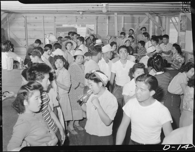 Keywords: Tule Lake Relocation Center, Newell, California. A view showing part of the crowd at general store . . . - NARA - 538213.jpg Scope and content The full caption for this photograph reads Tule Lake Relocation Center Newell California A view showing part of the crowd at general store Number 1 at this War Relocation Authority center where evacuees of Japanese descent are spending the duration General notes 538213 Local identifier 210-G-D14 Department of the Interior War Relocation Authority 02/16/1944 - 06/30/1946 NARA-Author Stewart Francis War Relocation Authority photographer Photographer 8464475 <br /> Still Picture Records Section Special Media Archives Services Division NWCS-S National Archives at College Park 8601 Adelphi Road College Park MD 20740-6001 1942-07-01 Record group Record Group 210 Records of the War Relocation Authority 1941 - 1989 Record group ARC 537 Central Photographic File of the War Relocation Authority compiled 1942 - 1945 Series ARC 536000 File unit File unit ARC Variant control numbers NAIL Control Number NWDNS-210-G-D14 Other versions <gallery> File Tule_Lake_Relocation_Center _Newell _California _A_view_showing_part_of_the_crowd_at_general_store_ _ _ _-_NARA_-_538213 tif tif File Tule_Lake_Relocation_Center _Newell _California _A_view_showing_part_of_the_crowd_at_general_store_ _ _ _-_NARA_-_538213 jpg jpg </gallery> NARA-cooperation PD-USGov People in Tule Lake War Segregation Center Shop Building interiors in California Shops Buildings in Tule Lake War Segregation Center ¢Shop Black and white photographs of people California 1942 in California Group July 1942 in the United States |