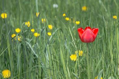 Keywords: tulip blossom bloom spring flower red plant early bloomer close grass meadow bed