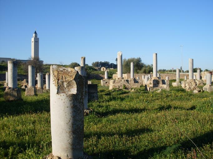 Keywords: Tunisie Basilique Damous el Karita 4.jpg fr Basilique de Damous el Karita avec en arrière plan la mosquée el Abidine own Rais67 2011 Cc-zero Basilica of Damous El Karita Malik ibn Anas Mosque Ancient Roman columns in Tunisia
