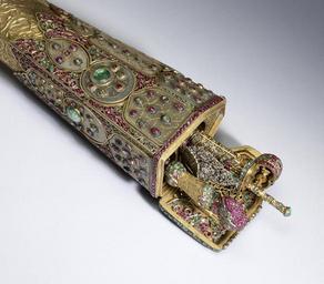 Keywords: Turkish - Rifle - Walters 5184 - Detail B (2).jpg Referencing the elite pastimes of hunting and writing this ceremonial jeweled rifle set includes a dagger pen case penholder with pen penknife cleaner and a spoon-all conveniently housed within the rifle butt Penknives were important elements in the calligrapher's toolset and their handles were often elaborately decorated The hardness of the reed used for pens throughout Islamic lands required a good blade to make a clean cut The small spoon was used to put black powder into the flash pan in preparation for firing the rifle The imperial monogram tughra of the Ottoman ruler Sultan Mahmud I r 1730-54 is inscribed in diamonds inside the hinged panel of the rifle butt The artist Muhammad and the rifle's owner Ahmad Khan who had possession of the rifle at some point are also named 1732-33 Early Modern rifle steel wood gold gilded silver gilded brass silver nephrite diamonds emeralds rubies or spinels ; dagger steel inlaid with gold rubies and beryls cm 24 8 139 7 7 accession number 51 84 22655 R S Pardo Constantinople date and mode of acquisition unknown Henry Walters Baltimore 1903 mode of acquisition unknown Walters Art Museum Henry Walters Acquired by Henry Walters 1903 Translation on barrel What God wills on flintlock Work of Muhammad; its owner is Ahmad Khan tughra hidden under panel in stock is that of Sultan Mahmud I r 1730-1754 place of origin Turkey <gallery> File Turkish - Rifle - Walters 5184 - Detail B jpg </gallery> Walters Art Museum license Islamic metalwork in the Walters Art Museum Weapons in the Walters Art Museum Firearms of the Ottoman Empire Art from Turkey Media contributed by the Walters Art Museum needs category review