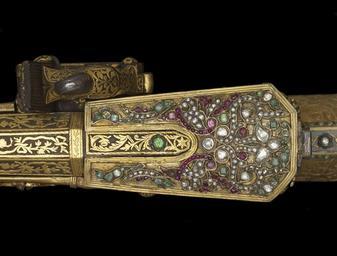 Keywords: Turkish - Rifle - Walters 5184 - Detail D.jpg Referencing the elite pastimes of hunting and writing this ceremonial jeweled rifle set includes a dagger pen case penholder with pen penknife cleaner and a spoon-all conveniently housed within the rifle butt Penknives were important elements in the calligrapher's toolset and their handles were often elaborately decorated The hardness of the reed used for pens throughout Islamic lands required a good blade to make a clean cut The small spoon was used to put black powder into the flash pan in preparation for firing the rifle The imperial monogram tughra of the Ottoman ruler Sultan Mahmud I r 1730-54 is inscribed in diamonds inside the hinged panel of the rifle butt The artist Muhammad and the rifle's owner Ahmad Khan who had possession of the rifle at some point are also named 1732-33 Early Modern rifle steel wood gold gilded silver gilded brass silver nephrite diamonds emeralds rubies or spinels ; dagger steel inlaid with gold rubies and beryls cm 24 8 139 7 7 accession number 51 84 22655 R S Pardo Constantinople date and mode of acquisition unknown Henry Walters Baltimore 1903 mode of acquisition unknown Walters Art Museum Henry Walters Acquired by Henry Walters 1903 Translation on barrel What God wills on flintlock Work of Muhammad; its owner is Ahmad Khan tughra hidden under panel in stock is that of Sultan Mahmud I r 1730-1754 place of origin Turkey Walters Art Museum license Tüfeks Islamic metalwork in the Walters Art Museum Weapons in the Walters Art Museum Art from Turkey