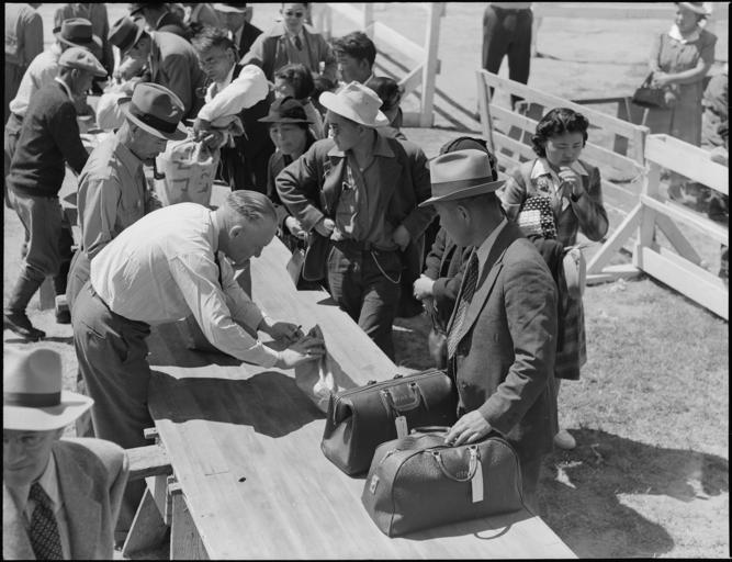 Keywords: Turlock, California. Heads of families of Japanese ancestry are gathered about the table where thei . . . - NARA - 537641.jpg Scope and content The full caption for this photograph reads Turlock California Heads of families of Japanese ancestry are gathered about the table where their hand- baggage is being inspected for contraband before being admitted into the Assembly center General notes 537641 Local identifier 210-G-C294 Department of the Interior War Relocation Authority 02/16/1944 - 06/30/1946 NARA-Author Lange Dorothea 1895-1965 Photographer 1372774 <br /> Still Picture Records Section Special Media Archives Services Division NWCS-S National Archives at College Park 8601 Adelphi Road College Park MD 20740-6001 1942-05-02 Record group Record Group 210 Records of the War Relocation Authority 1941 - 1989 Record group ARC 537 Central Photographic File of the War Relocation Authority compiled 1942 - 1945 Series ARC 536000 File unit File unit ARC Variant control numbers NAIL Control Number NWDNS-210-G-C294 Other versions <gallery> File Turlock _California _Heads_of_families_of_Japanese_ancestry_are_gathered_about_the_table_where_thei_ _ _ _-_NARA_-_537641 tif tif File Turlock _California _Heads_of_families_of_Japanese_ancestry_are_gathered_about_the_table_where_thei_ _ _ _-_NARA_-_537641 jpg jpg </gallery> NARA-cooperation PD-USGov Dorothea Lange Turlock Assembly Center