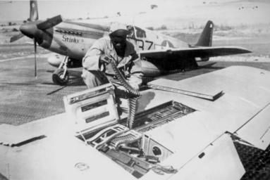 Keywords: Tuskeegee reload P-51.jpg A USAAF armourer of the 100th Fighter Squadron 332nd Fighter Group 15th U S Air Force checks ammunition belts of the 50 caliber 12 7 mm machine guns in the wings of a North American P-51B Mustang in Italy ca September 1944 The 332nd Fighter Group was composed of Afro-American pilots and ground support personnel trained at Tuskegee Alabama USA and the members of the group became collectively known as the Tuskegee Airmen <br> Original caption An armorer of the 15th U S Air Force checks ammunition belts of the 50 caliber machine guns in the wings of a P-51 Mustang fighter plane before it leaves an Italian base for a mission against German military targets The 15th Air Force was organized for long range assault missions and its fighters and bombers range over enemy targets in occupied and satellite nations as well as Germany itself ca 09/1944 National Archives http //www archives gov/research/african-americans/ww2-pictures/ aaf Pictures of African Americans During World War II http //www archives gov/research/african-americans/ww2-pictures/images/african-americans-wwii-055 jpg image 55 208-MO-18H-32984 ca 1944-09 USAAF PD-USGov 535764 People with ammunition belts Browning AN/M2 Armorers Reloading firearms P-51C Mustang Tuskegee Airmen 332d Fighter Group United States Army Air Forces |