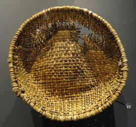Keywords: Twill-plaited ring basket, 900-1400 AD, Kayenta Anasazi, Twin Cave House, Arizona, yucca leaves - Natural History Museum of Utah - DSC07308.JPG en Exhibit in the Natural History Museum of Utah Salt Lake City Utah USA This item is old enough so that it is in the public domain Photography was permitted in the museum without restriction 2013-03-17 14 58 04 own Daderot cc-zero Anasazi basketry in the Natural History Museum of Utah Uploaded with UploadWizard