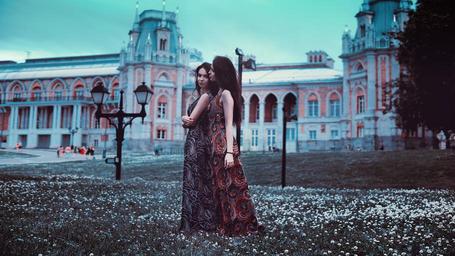 Keywords: twins moscow sisters russia grass tsaritsyno museum homestead blue sky green grass beautiful girls dress blue bright glamour hair