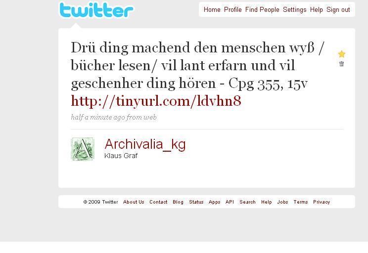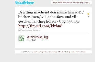 | Keywords: Twitter Tweet.JPG  A Twitter tweet http //twitter com/Archivalia_kg/status/2590767461; Initial http //www cnrtl fr/artdico/ficheDictionnaire php cleDictionnaire 28 Dictionnaire des armées de terre et de mer - 1862 - Adolphe de Chesnel 1791 - 1862 2009 Author of the tweet Klaus Graf citing text from http //diglit ub uni-heidelberg de/diglit/cpg355/0034 an anonymous Swabian text collection from the 15th century http //digi ub uni-heidelberg de/sammlung2/werk/pdf/cpg355 pdf For the cited text and the initial PD-old-100 Other written text is PD-ineligible For the Twitter logo PD-textlogo Trademark badJPG Twitter Klaus Graf Historian Tweet |