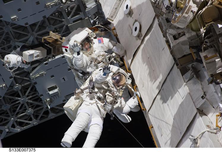 Keywords: two astronauts spacewalk space shuttle discovery tools suit pack tether floating job maintenance extravehicular activity balance teamwork