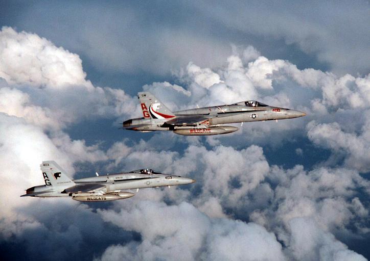 MAKE A MEME View Large Image 960326-N-3843H-001 F-A-18 In Flight.jpg en 960326-N-3843H-001 Two F/A-18C Hornets from the Wildcats of Strike Fighter Squadron One Three One VFA-131 patrol the skies over the Arabian Gulf March 25 1996 VFA 131 is part of Carrier Air Wing ...