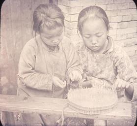"2 little girls putting fuses into firecrackers, to earn a few coppers."; Captions for this set of lantern slides from the papers of Oliver and Jennie Logan, American Presbyterian missionaries in Hunan, were provided by their daughter Elsa.
