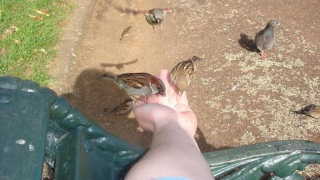 | Keywords: Two House Sparrows (Passer domesticus) feeding from hand.JPG in flight at the top of the image They are feeding on oatmeal while other House Sparrows and a Rock Pigeon Columba livia stand on the ground below them Sparrows and pigeons are the most friendly birds at the park though others like Mynas or Blackbirds will also take food if it's on offer It's not common for a House Sparrow to fly up and eat out of your hand in my experience but they were doing it at this time and place quite reliably A female was even making very regular trips to collect oats and then feed her begging offspring Own Richard001 2008-11-21 -36 850406 174 767944 region NZ Passer domesticus flocks Feral pigeons Passer domesticus in flight male Albert Park Auckland Human hands holding birds Passer domesticus eating Oatmeal Original uploads by User Richard001 Feeding animals |