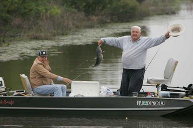 View Original:Two older men enjoying fishing from boat one man is standing and raising hat while showing the fish he just caught.jpg (3504x2336)