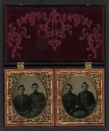 Keywords: library of congress libraryofcongress dc:identifier=http://hdl.loc.gov/loc.pnp/ppmsca.27558 dc:identifier=httphdllocgovlocpnpppmsca27558 xmlns:dc=http://purl.org/dc/elements/1.1/ xmlns:dc=httppurlorgdcelements11 u.s. civil war uscivilwar american civil war americancivilwar the civil war thecivilwar civil war civilwar war between the states warbetweenthestates united states of america unitedstatesofamerica u.s.a. usa the union theunion union the north thenorth yankee yankees soldier soldiers people indoor [Two pairs of unidentified soldiers in Union shell jackets] [between 1861 and 1865] 2 photographs in 1 case : sixth-plate tintype, hand-colored ; 9.6 x 16.0 cm (case) Notes: Title devised by Library staff. Case: Berg, no. 1-14 Photographs show soldier on the right of left tintype with chevrons that designate him to be a corporal. Soldier on the right of the right tintype holds a forage cap with an unidentified Company insignia. Gift; Tom Liljenquist; 2010; (DLC/PP-2010:105). Purchased from: The Horse Soldier, Gettysburg, Pa., 2006. Subjects: United States.--Army--People--1860-1870. Soldiers--Union--1860-1870. Military uniforms--Union--1860-1870. United States--History--Civil War, 1861-1865--Military personnel--Union. Format: Group portraits--1860-1870. Portrait photographs--1860-1870. Tintypes--Hand-colored--1860-1870. Rights Info: No known restrictions on publication. Repository: Library of Congress, Prints and Photographs Division, Washington, D.C. 20540 USA, hdl.loc.gov/loc.pnp/pp.print Part Of: Ambrotype/Tintype filing series (Library of Congress) (DLC) 2010650518 Liljenquist Family collection (Library of Congress) (DLC) 2010650519 More information about this collection is available at hdl.loc.gov/loc.pnp/pp.lilj Persistent URL: hdl.loc.gov/loc.pnp/ppmsca.27558 Call Number: AMB/TIN no. 5053 [Two pairs of unidentified soldiers in Union shell jackets] [between 1861 and 1865] 2 photographs in 1 case : sixth-plate tintype, hand-colored ; 9.6 x 16.0 cm (case) Notes: Title devised by Library staff. Case: Berg, no. 1-14 Photographs show soldier on the right of left tintype with chevrons that designate him to be a corporal. Soldier on the right of the right tintype holds a forage cap with an unidentified Company insignia. Gift; Tom Liljenquist; 2010; (DLC/PP-2010:105). Purchased from: The Horse Soldier, Gettysburg, Pa., 2006. Subjects: United States.--Army--People--1860-1870. Soldiers--Union--1860-1870. Military uniforms--Union--1860-1870. United States--History--Civil War, 1861-1865--Military personnel--Union. Format: Group portraits--1860-1870. Portrait photographs--1860-1870. Tintypes--Hand-colored--1860-1870. Rights Info: No known restrictions on publication. Repository: Library of Congress, Prints and Photographs Division, Washington, D.C. 20540 USA, hdl.loc.gov/loc.pnp/pp.print Part Of: Ambrotype/Tintype filing series (Library of Congress) (DLC) 2010650518 Liljenquist Family collection (Library of Congress) (DLC) 2010650519 More information about this collection is available at hdl.loc.gov/loc.pnp/pp.lilj Persistent URL: hdl.loc.gov/loc.pnp/ppmsca.27558 Call Number: AMB/TIN no. 5053 |
