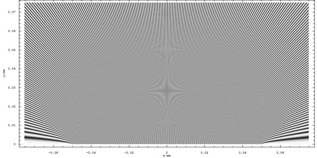 Keywords: Two Slit Interference, 800nm wl, 0.1mm d, close up average.png Density plot of two slit inteference of 800nm light thtrough slits 0 1mm apart The equation is <math>u x y t \sin \left k \sqrt \left x-\frac d 2 \right 2 + y 2 \right + \sin \left k \sqrt \left x+\frac d 2 \right 2 + y 2 \right </math> where d is the slit separations k is the wavenumber 2Ï /λ x is the distance from the origin on the line containing the slits y is the distance from the plane contining the slits This is a plot of the average absolute value of the wave over one full cycle taken by sampling the wave at 40 times Own Mathematica 2007-06-13 Inductiveload Mathematica Code border solid 2px BF0C1D; ; valign top ; width 75 align center 50px Please be aware that at the time of uploading 19 08 17 June 2007 UTC this code may take a significant amount of time to execute on a consumer-level computer 50px <pre> ux_ y_ z_ t_ Sink Sqrty 2 + x + d/2 2 + z 2 + ω t + Sink Sqrty 2 + x - d/2 2 + z 2 + ω t; farav DensityPlot x xmm/1000; y ymm/1000; Sum Absux y 0 n n 0 Ï„ Ï„/40 /40 xmm -0 075 0 075 ymm 0 0 075 PlotPoints -> 1000 AspectRatio -> 0 5 ImageSize -> 1000 Mesh -> False FrameLabel -> y/mm z/mm </pre> Double-slit experiments |