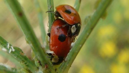 Keywords: Two-spotted lady beetles (Adalia bipunctata) mating.JPG Two-spotted lady beetles Adalia bipunctata mating At first I disturbed the male and thought I had lost the chance to photograph them mating but when I put him back on the plant he quickly found the female and resumed As you can see there are also a lot of small insects on the plant which they probably feed on This was taken near the University of Auckland Tamaki campus on the campus side of Merton road Own Richard001 2009-02-11 36 52 50 68 S 174 51 10 71 E region NZ Adalia bipunctata Coccinellidae sex Original uploads by User Richard001 |