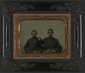 Keywords: library of congress libraryofcongress dc:identifier=http://hdl.loc.gov/loc.pnp/ppmsca.27546 dc:identifier=httphdllocgovlocpnpppmsca27546 xmlns:dc=http://purl.org/dc/elements/1.1/ xmlns:dc=httppurlorgdcelements11 u.s. civil war uscivilwar american civil war americancivilwar the civil war thecivilwar civil war civilwar war between the states warbetweenthestates united states of america unitedstatesofamerica u.s.a. usa the union theunion union the north thenorth yankee yankees soldier soldiers groupshot people picture frame [Two unidentified soldiers in Union uniforms] [between 1861 and 1865] 1 photograph : half-plate tintype, hand-colored ; 20.5 x 17.6 cm (case) Notes: Title devised by Library staff. Case: Berg, no. 7-10. Gift; Tom Liljenquist; 2010; (DLC/PP-2010:105). Subjects: United States.--Army--People--1860-1870. Soldiers--Union--1860-1870. Military uniforms--Union--1860-1870. United States--History--Civil War, 1861-1865--Military personnel--Union. Format: Group portraits--1860-1870. Portrait photographs--1860-1870. Tintypes--Hand-colored--1860-1870. Rights Info: No known restrictions on publication. Repository: Library of Congress, Prints and Photographs Division, Washington, D.C. 20540 USA, hdl.loc.gov/loc.pnp/pp.print Part Of: Ambrotype/Tintype filing series (Library of Congress) (DLC) 2010650518 Liljenquist Family collection (Library of Congress) (DLC) 2010650519 More information about this collection is available at hdl.loc.gov/loc.pnp/pp.lilj Persistent URL: hdl.loc.gov/loc.pnp/ppmsca.27546 Call Number: AMB/TIN no. 5039 [Two unidentified soldiers in Union uniforms] [between 1861 and 1865] 1 photograph : half-plate tintype, hand-colored ; 20.5 x 17.6 cm (case) Notes: Title devised by Library staff. Case: Berg, no. 7-10. Gift; Tom Liljenquist; 2010; (DLC/PP-2010:105). Subjects: United States.--Army--People--1860-1870. Soldiers--Union--1860-1870. Military uniforms--Union--1860-1870. United States--History--Civil War, 1861-1865--Military personnel--Union. Format: Group portraits--1860-1870. Portrait photographs--1860-1870. Tintypes--Hand-colored--1860-1870. Rights Info: No known restrictions on publication. Repository: Library of Congress, Prints and Photographs Division, Washington, D.C. 20540 USA, hdl.loc.gov/loc.pnp/pp.print Part Of: Ambrotype/Tintype filing series (Library of Congress) (DLC) 2010650518 Liljenquist Family collection (Library of Congress) (DLC) 2010650519 More information about this collection is available at hdl.loc.gov/loc.pnp/pp.lilj Persistent URL: hdl.loc.gov/loc.pnp/ppmsca.27546 Call Number: AMB/TIN no. 5039 |