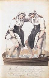 Keywords: Two washerwomen, tamping the laundry in a tub, by Gesina ter Borch.jpg en Two women tamping the laundry in a tub brown quill brush on paper 31 3 x 20 4 cm 1652 - 1653 inscribed with the song that washerwoman sang nl Ons treen dat straelt en spat nae onse best vermogen / Het roert en raeckt oock wat ons Hemden moeten wij drogen / Wij treen om t'maeken schoon en sijn daer toe genegen / Diet beeter kan als wij die komt en doet te Degen en We step so that it splashes and spatters to the best of our ability / It stirs and it hits some things we have to dry our shirts / We step to clean and we are willing to do so / He who can do better than us come forward and do it thorough between 1652 1653 https //www rijksmuseum nl/nl/collectie/BI-1890-1952-14 Rijksmuseum Amsterdam Creator Gesina ter Borch PD-Art-100 Uploaded with UploadWizard Gesina ter Borch 1652 Dutch 17th-century drawings in the Rijksmuseum Amsterdam Borch Gesina Ter |