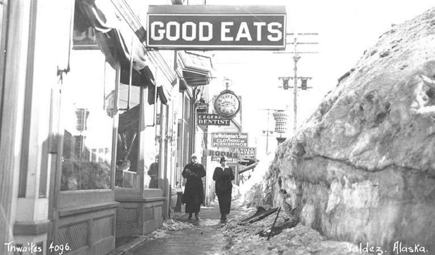 | Keywords: Two women on sidewalk in Valdez, with snow piled along side, ca 1912 (THWAITES 248).jpeg check categories 27 October 2016 4 Photograph Creator John E Thwaites Caption on image Valdez Alaska PH Coll 247 530<br/>Valdez is located on the north shore of Port Valdez a deep water fjord in Prince William Sound It lies 305 road miles east of Anchorage and 364 road miles south of Fairbanks It is the southern terminus of the Trans-Alaska oil pipeline The Port of Valdez was named in 1790 by Don Salvador Fidalgo for the celebrated Spanish naval officer Antonio Valdes y Basan Due to its excellent ice-free port a town developed in 1898 as a debarkation point for men seeking a route to the Eagle Mining District and the Klondike gold fields Valdez soon became the supply center of its own gold mining region and incorporated as a City in 1901 Fort Liscum was established in 1900 and a sled and wagon road was constructed to Fort Egbert in Eagle by the U S Army The Alaska Road Commission further developed the road for automobile travel to Fairbanks; it was completed by the early 1920s Tsunamis generated by the 1964 earthquake destroyed the original City killing several residents The community was rebuilt in a more sheltered location 4 miles to the west During the 1970s construction of the Trans-Alaska oil pipeline terminal and other cargo transportation facilities brought rapid growth to Valdez In March 1989 it was the center for the massive oil-spill cleanup after the Exxon VALDEZ disaster In a few short days the population of the town tripled Subjects LCTGM Valdez Alaska ; Snow--Alaska--Valdez; Stores shops--Alaska--Valdez; Sidewalks--Alaska--Valdez; Women--Alaska--Valdez depicted place Valdez Alaska ca 1912 Institution University of Washington UWASH-THWAITES-source accession number thwaites 248 PD-old-auto-1923 1940 Information field Order Number THW272 Images from the John E Thwaites Photographs of Alaska Collection to check Valdez Alaska Snow in Alaska Sidewalks in Alaska Women |
