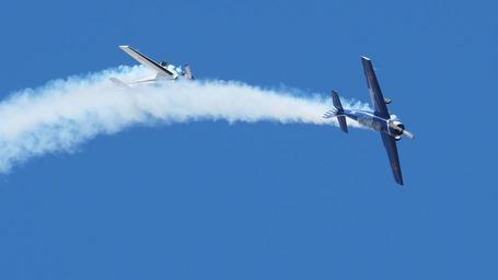 Keywords: Two Yak-52s chasing each other through a looping.jpg Two Yak-52s chasing each other at the top of a looping with smoke trails Yakovlev Yak-52 ZK-PTE ZK-YAK Private Red Star Aerobatic Team Photograph Hood Aerodrome Masterton New Zealand 2015-01-17 Pseudopanax wikipedia en Own 40 58 0 S 175 40 0 E Yakovlev Yak-52 Wings over Wairarapa 2015 Aircraft in flight Smoke trails of aerobatic teams |