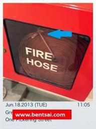 Blue arrow points to the pink string typing up the fire hose that would affect emergency response time due to the need to search for a knife or scissors to remove the string.