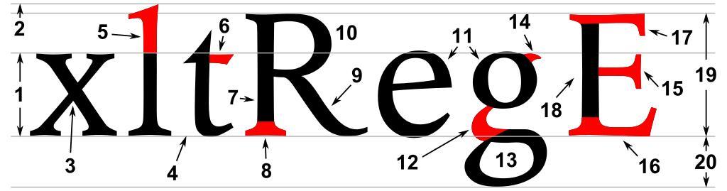 | Keywords: Typoghaphia.svg parti tipografiche dei caratteri <br>1 - occhio medio od altezza si misura sempre sulla x <br>2 - altezza massima<br>3 - apice<br>4 - linea di base<br>5 - ascendente<br>6 - incrocio<br>7 - asta verticale<br>8 - grazia<br>9 - gamba<br>10 - occhiello<br>11 - spaziatura<br>12 - collo<br>13 - occhiello<br>14 - orecchio<br>15 - cravatta<br>16 - asta orizzontale<br>17 - braccio<br>18 - asta verticale<br>19 - altezza della maiuscola<br>20 - dicendente typographic parts of a glyph <br>1 - x-height <br>2 - ascender line<br>3 - apex<br>4 - baseline<br>5 - ascender<br>6 - crossbar<br>7 - stem<br>8 - serif<br>9 - leg<br>10 - bowl<br>11 - counter<br>12 - collar<br>13 - loop<br>14 - ear<br>15 - tie<br>16 - horizontal bar<br>17 - arm<br>18 - vertical bar<br>19 - cap height<br>20 - descender line 2006-11-16 F l a n k e r typographic font designed by myself named Imperator Examples of typography terms Typographia.svg parti tipografiche dei caratteri <br>1 - occhio medio od altezza si misura sempre sulla x <br>2 - altezza massima<br>3 - apice<br>4 - linea di base<br>5 - ascendente<br>6 - incrocio<br>7 - asta verticale<br>8 - grazia<br>9 - gamba<br>10 - occhiello<br>11 - spaziatura<br>12 - collo<br>13 - occhiello<br>14 - orecchio<br>15 - cravatta<br>16 - asta orizzontale<br>17 - braccio<br>18 - asta verticale<br>19 - altezza della maiuscola<br>20 - dicendente typographic parts of a glyph <br>1 - x-height <br>2 - ascender line<br>3 - apex<br>4 - baseline<br>5 - ascender<br>6 - crossbar<br>7 - stem<br>8 - serif<br>9 - leg<br>10 - bowl<br>11 - counter<br>12 - collar<br>13 - loop<br>14 - ear<br>15 - tie<br>16 - horizontal bar<br>17 - arm<br>18 - vertical bar<br>19 - cap height<br>20 - descender line typographische Teile einer Glyphe <br>1 - Mittellänge x-Höhe <br>2 - Oberlinie k-Linie<br>3 - Apex <br>4 - Grundlinie<br>5 - Oberlänge<br>6 - Querstrich <br>7 - Stamm Hasta<br>8 - Serife<br>9 - Bein<br>10 - <br>11 - Punze<br>12 - Steg<br>13 - Schleife<br>14 - Ohr<br>15 - <br>16 - <br>17 - Arm <br>18 - <br>19 - Versalhöhe<br>20 - Unterlänge 2006-11-16 F l a n k e r typographic font designed by myself named Imperator Examples of typography terms |