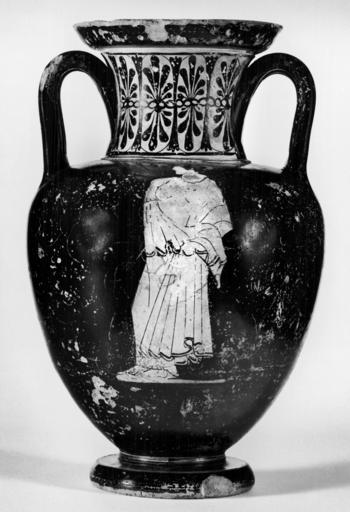Keywords: Tyszkiewicz Painter - Small Neck-Amphorae - Walters 4858 - Side B.jpg This amphora depicts a bearded mantled man on the front He is leaning over and resting on a staff to the right His head is lowered and he holds out a necklace or wreath in his hands for the woman on the back The paint for the object he holds is lost but the preliminary sketch indicates it was there or intended A woman on the back wears a chiton and mantle and stands to the left Her right arm is hidden underneath her drapery but her left hand and arm although covered by drapery can be perceived at her side Her hair is tied up in a bun at back Her pose with shoulders straight suggests that she is attentive to the offering of the man on the front ca 480 BC Classical terracotta H 12 11/16 x Max Diam 8 1/16 in 32 3 x 20 4 cm ; Diam at rim cm 14 6 ; Diam at foot cm 11 3 accession number 48 58 33313 Don Marcello Massarenti Collection Rome date and mode of acquisition unknown Henry Walters city Baltimore Walters Art Museum Henry Walters Acquired by Henry Walters with the Massarenti Collection 1902 place of origin Attica Greece Walters Art Museum license Ancient Greek red-figure pottery in the Walters Art Museum Tyszkiewicz Painter Media contributed by the Walters Art Museum needs category review Media contributed by the Walters Art Museum needs artist update |