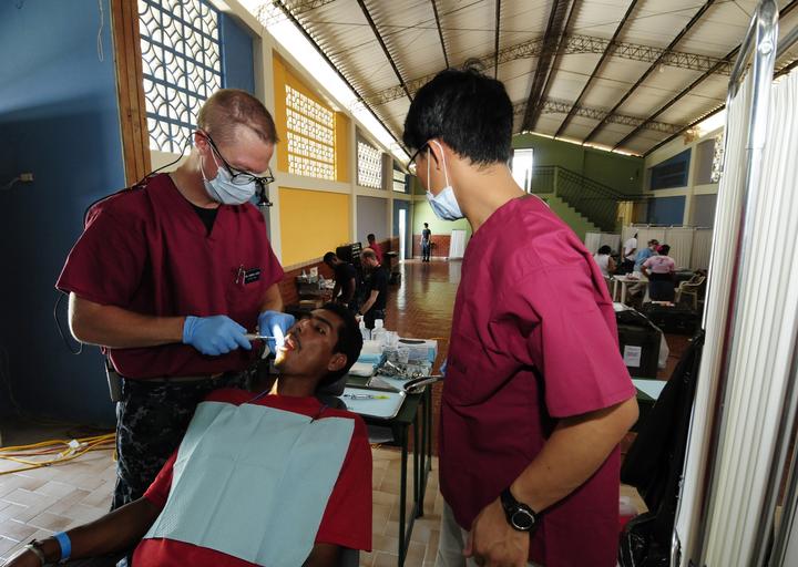 | Keywords: U.S. Navy Lt. Joshua Fair, a dentist from the hospital ship USNS Comfort (T-AH 20), extract an Ecuadorian patient's tooth.jpg USNS Comfort T-AH 20 and a non-governmental organization volunteer dental hygienist extract an Ecuadorian patient's tooth during a medical community service event for Continuing Promise 2011 in Manta Ecuador May 15 2011 Continuing Promise is a regularly scheduled mission to countries in Central and South America and the Caribbean where the U S Navy and its partnering nations work with host nations and a variety of governmental and nongovernmental agencies to train in civil-military operations http //dentistofficefinder com Dentist office finder DoD photo by Mass Communication Specialist 1st Class Kim Williams U S Navy/Released 2011-05-15 10 25 00 https //www flickr com/photos/39955793 N07/5730494855/ U S Department of Defense Current Photos other versions PD-USGov USNS Comfort T-AH-20 in Manta Military dentistry |