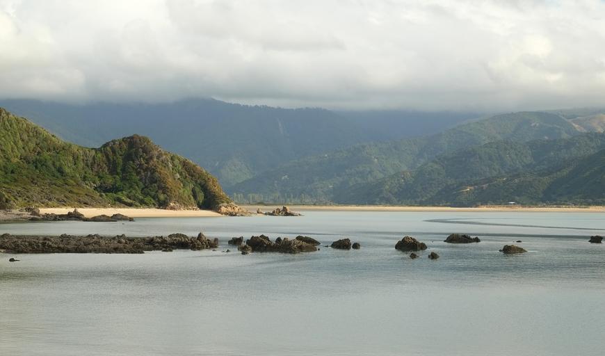 Keywords: Uarau Point and Wainui Bay.jpg Uarau Point and Wainui Bay Own 2015-04-06 Pseudopanax wikipedia en 40 47 22 4 S 172 57 18 4 E Bays of New Zealand Abel Tasman National Park