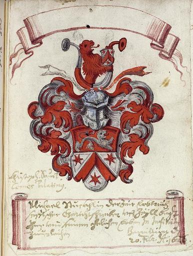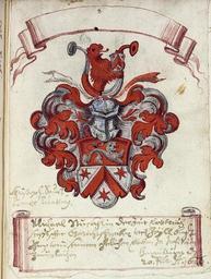 Keywords: UBHD Cod Sal IX 58 133r Sturmlin.jpg Wappen aus dem Wappenbuch des Hofpfalzgrafen Franz Rasso Gotthardt Entstanden in Süddeutschland Passau Universitätsbibliothek Heidelberg Cod Sal IX 58 <br />Wappen http //digi ub uni-heidelberg de/diglit/salIX58 after 1597 1623 “1631 Franz Rasso Gotthardt PD-old-100 Wappenbuch der Hofpfalzgrafen Coats of arms of families of Germany - S Sturmlin Argent a chevron gules 3 six rays gules in heraldry Gules a lion argent Lions rampant in crest Bull horns in crest Argent and gules in heraldry Party per fess shields