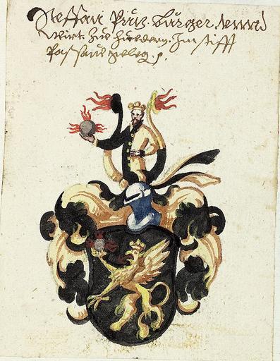 Keywords: UBHD Cod Sal IX 58 062r Pr--.jpg Wappen aus dem Wappenbuch des Hofpfalzgrafen Franz Rasso Gotthardt Entstanden in Süddeutschland Passau Universitätsbibliothek Heidelberg Cod Sal IX 58 <br />Wappen Steffan Pruz Bürger und Wirt zu Hu ¦ im Stift Passau gelegen http //digi ub uni-heidelberg de/diglit/salIX58 after 1597 1623 “1631 Franz Rasso Gotthardt PD-old-100 Wappenbuch der Hofpfalzgrafen Coats of arms of families of Germany - P Pruz Griffins in heraldry Grenades in heraldry Men in crest Fire in crest Bull horns in crest Gules Or sable in heraldry |