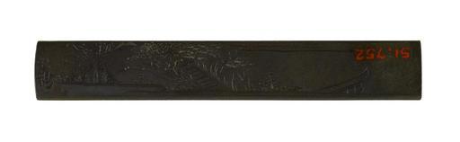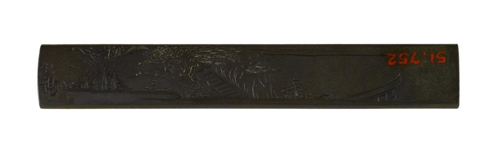 Keywords: Uchikoshi Hirochika - Kozuka of a Flintlock Pistol - Walters 51752 - Back.jpg On the front of the kozuka is a relief carving of a pistol made of gold silver and copper The subject matter is an interesting pairing with the traditional sword on which the kozuka would have been mounted On the reverse is a landscape scene The edge of a torii gate is visible on the right with a path extending towards the left into trees The artist's signature is also on the reverse ca 1825 late Edo shibuichi gold silver copper cm 9 6 accession number 51 752 5034 William T / Henry Walters Collection Baltimore date and mode of acquisition unknown Walters Art Museum Henry Walters Acquired by William T or Henry Walters Signature Hirochika place of origin Japan Walters Art Museum license Tosogu Japanese sword fittings in the Walters Art Museum Uchikoshi Hirochika Media contributed by the Walters Art Museum needs category review |