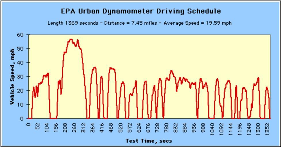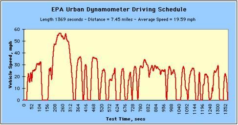 | Keywords: Uddsdds.gif en The U S Urban Dynamometer Driving Schedule UDDS is defined in the US Code of Federal Regulations CFR 40 86 App I and is also known as the FTP-72 Federal Test Procedure cycle or LA-4 cycle The cycle simulates an urban route of 7 5 mi 12 07 km with frequent stops The maximum speed is 56 7 mph 91 2 km/h and the average speed is 19 6 mph 31 5 km/h The same cycle is known in Sweden as the A10 or CVS Constant Volume Sampler and in Australia as the ADR 27 Australian Design Rules See also US 40 CFR 86 App I http //www epa gov/oms/sftp htm http //www dieselnet com/standards/cycles/ftp72 html http //www epa gov/oms/emisslab/methods/uddsdds gif U S Environmental Protection Agency 1972 PD-USGov Check categories 2011 January 12 en wikipedia Fuel_economy_in_automobiles 1 Fuel economy in automobiles Emission standards |