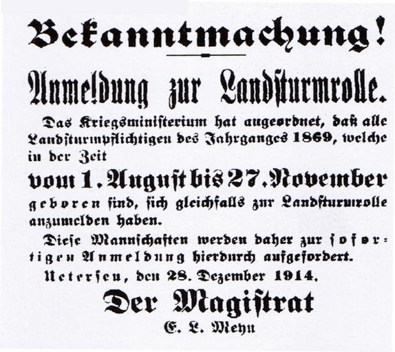 Keywords: Uetersen Anmeldung zun Landsturm 1914.jpg de Zeitungsanzeige in den Uetersener Nachrichten vom 28 Dezember 1914 eigene reproduktion das Original mehr als 70 Jahre alt own reproduktion original is more than 70 years old Author 1914 Germany in World War I Documents of Uetersen World War I PD-old |