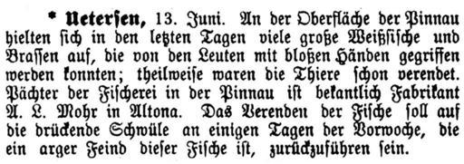 Keywords: Uetersen Bekanntmachung Pinnau 1899.jpg de Bekanntmachung über ein Fischsterben in der Pinnau vermutlich durch starke Schwüle im Juni 1899 im Uetersener Tageblatt vom 15 Juni 1899 eigene reproduktion das Original mehr als 100 Jahre alt own reproduktion original is more than 100 years old Author 1899-06-15 Pinnau Documents of Uetersen PD-old |