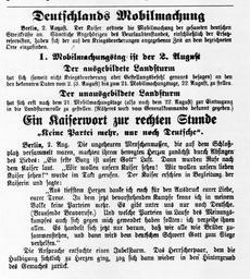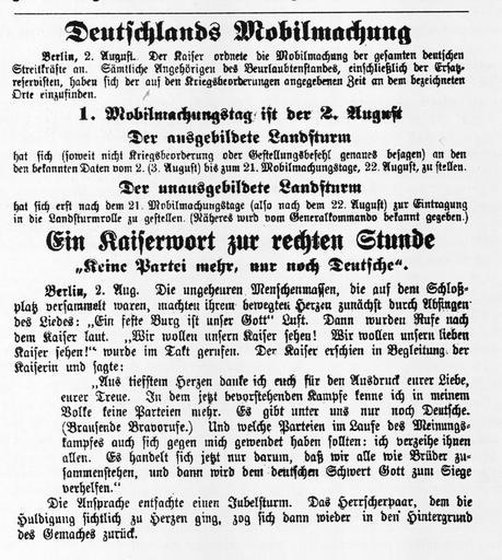 Keywords: Uetersen Mobilmachung 1914.jpg de Extra-Ausgabe der Uetersener Nachrichten von Sonntag den 2 August 1914 Deutsche Mobilmachung eigene reproduktion das Original mehr als 70 Jahre alt own reproduktion original is more than 70 years old Author 1914-08-02 Germany in World War I Documents of Uetersen World War I PD-old |